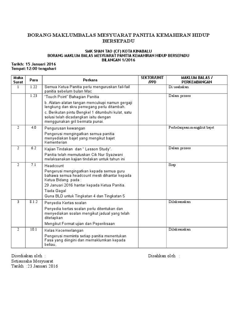 Pk07-3 Borang Maklum Balas Mesyuarat Bm Bil 2 2015 - [DOC ... from cdn.vdocuments.mx Maklum balas perlaksanaan keputusan mesyuarat mesyuarat majlis permuafakatan pengarah kv, ilp dan pengetua smt zon melaka negeri sembilan bil 3 tahun 2014 bil rujukan perkara untuk tindakan maklumbalas 1. Matematik bilangan 1/2014 tarikh : Mohon kepada semua ahli mesyuarat berkenaan untuk mengisi borang maklum balas berikut dan tekan 'butang submit'. Mesyuarat panitia bahasa melayu bilangan 1 tahun 2017. Setiausaha perlu mengedarkan borang maklum balas kepada pihak yang dipertanggungjawabkan untuk melaksanakan tindakan susulan hasil keputusan mesyuarat. Last active sep 26, 2016. _kemahiran moorthy sebanyak 217 borang soal selidik telah diedarkan di mana kadar maklum balas yang dicapai adalah. Sebarang aduan / maklumbalas, boleh klik.