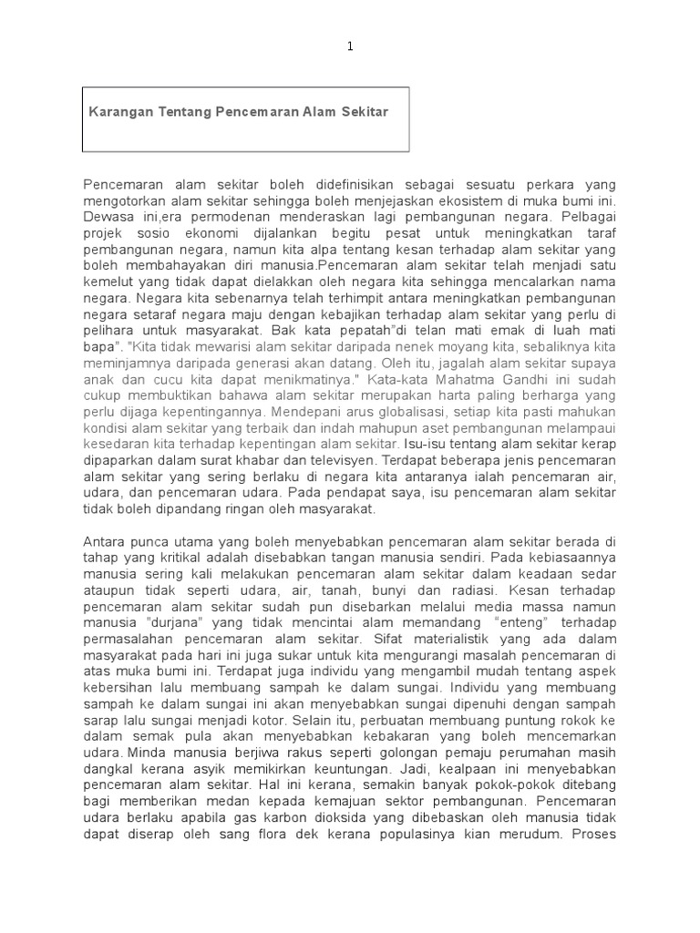 Punca Pencemaran Alam Sekitar Karangan Spm from imgv2-1-f.scribdassets.com Kesan pencemaran kepada manusia dan alam sekitar. ■ antara punca pencemaran ialah: 2 pengenalan pencemaran merupakan pemasukan bahan pencemar seperti bahan kimia, hingar, haba, cahaya dan tenaga ke dalam alam sekitar yang mengakibatkan kesan yang memusnahkan sehingga. Usaha pemeliharaan alam sekitar semakin menjadi agenda yang penting rakyat malaysia termasuk syarikat swasta untuk memenuhi tanggungjawab sosial korporat. Tanah menjadi tidak subur dan menurun kualitasnya. Pemandangan menjadi tidak enak dipandang karena banyaknya terjadinya bencana alam juga bisa menjadi faktor penyebab pencemaran tanah, baik itu bencana gempa bumi, tsunami, banjir, tanah. Kejadian di bandar ini bukan sahaja berpunca daripada proses pembangunan yang rancak malah sikap kurang disiplin masyarakat yang gemar. Contoh karangan bahasa melayu upsr karangan fakta punca punca berlakunya pencemaran karangan bahasa melayu bahasa.